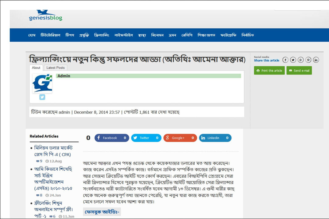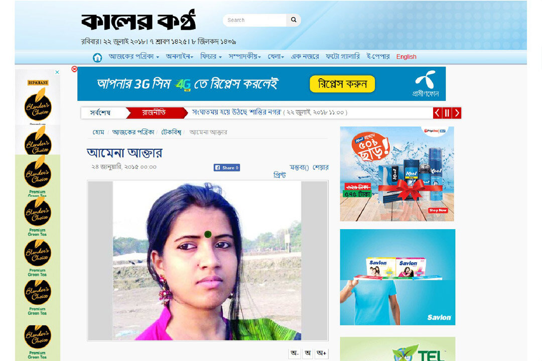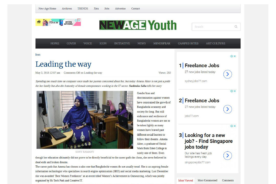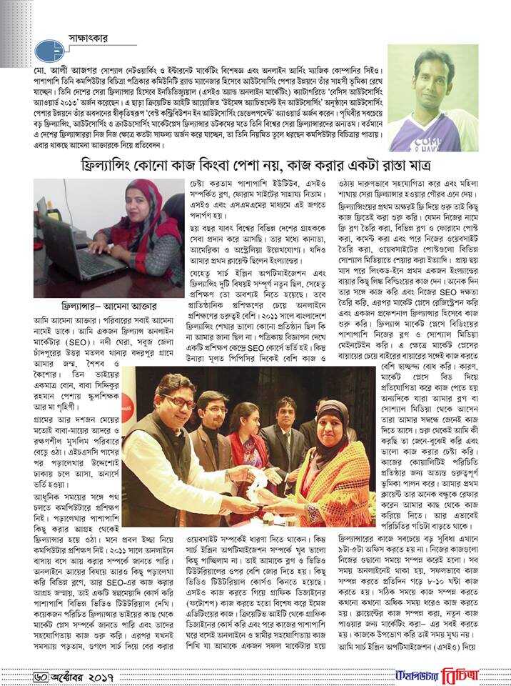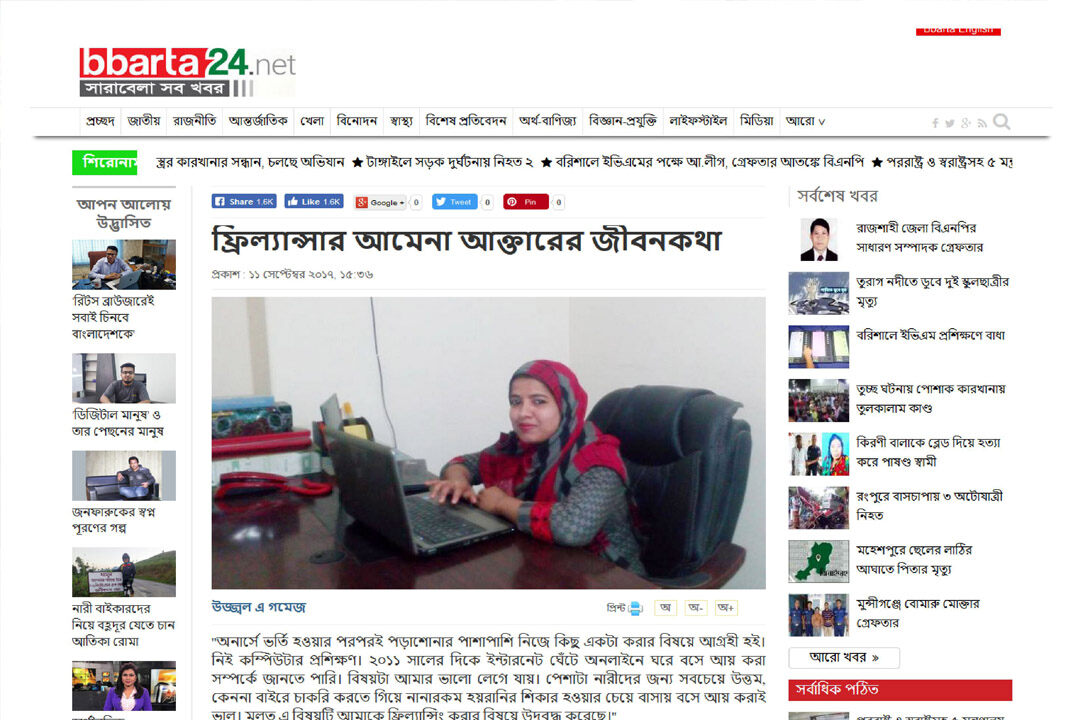 24 January 2015 Daily Kalerkantho has been published a News about me- “Amena Akter considers online freelancing from home to be more suitable for women than working.” bbarta24 has been published a feature Story in 11 September 2017 -“The life story of freelancer Amena Akter.” Again bbarta24 has been published a feature in 12 June 2019-“Freelancer Amena Akter wants to do social service”….Also Computer Bicitra, Genesis Blog, New Age Youth, Techshohor wrote some feature